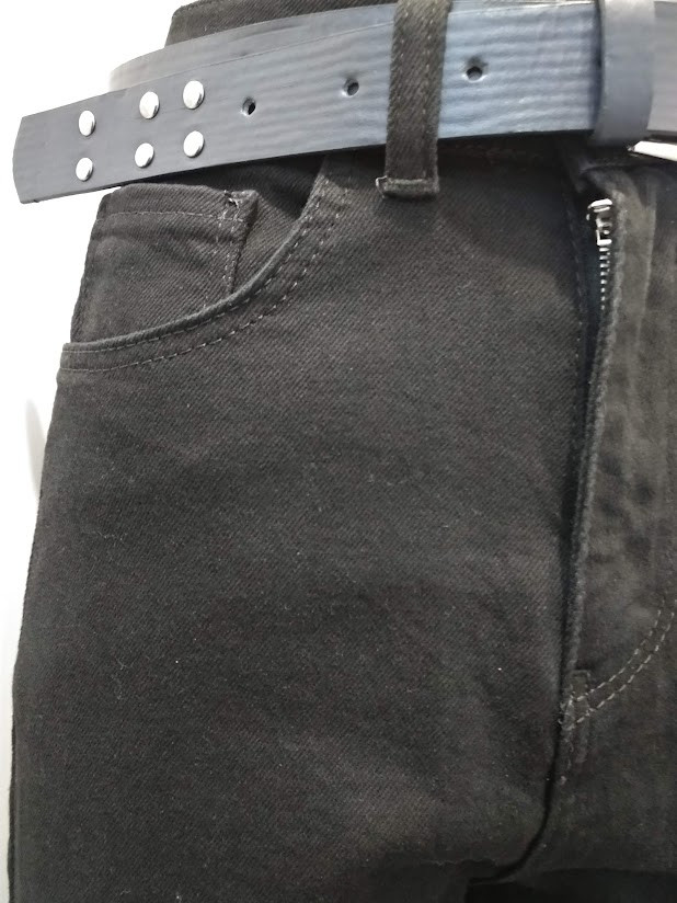 Пояс із петлями для ременя, застібка на блискавку та металевий ґудзик. Дві бічні кишені глибиною 15 см, дві задні накладні кишені та маленька кишеня для монет спереду.