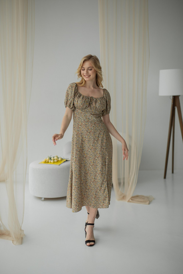 Бежева жіноча сукня міді довжини з квітковим принтом, виконана у фасоні селянка. Модель з коротким рукавом на резинці та вирізом спереду, який доповнено зав’язками.