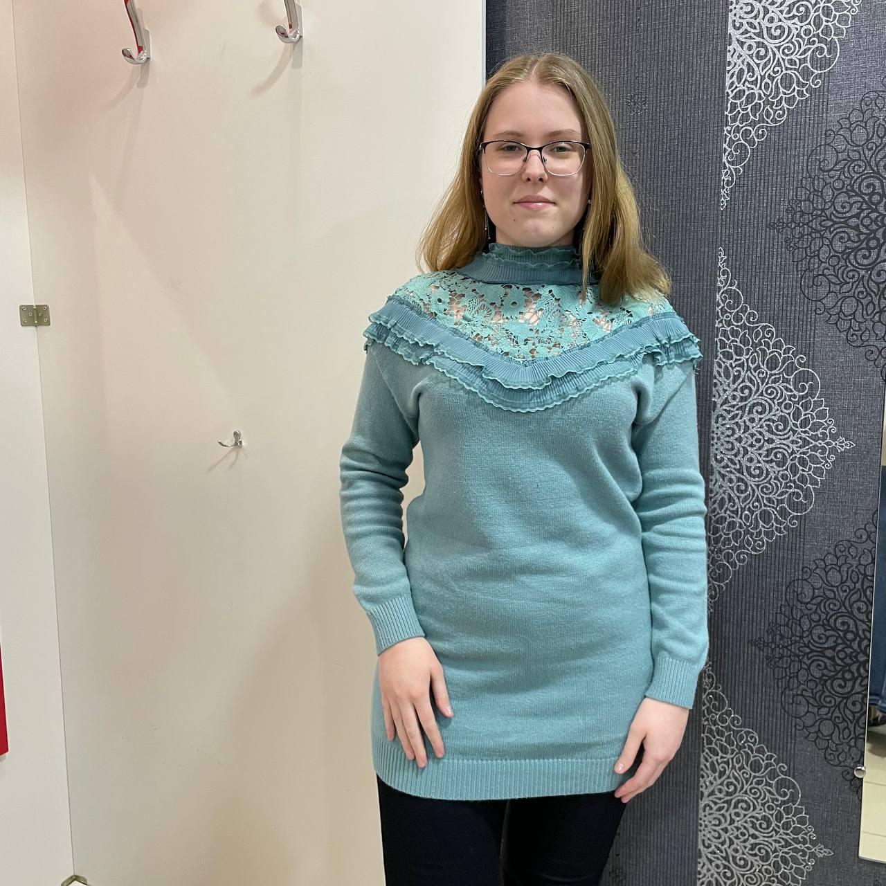 Светр має комір-стійку з оригінальним акцентом – у зоні декольте вставлене мереживо, яке створює жіночний та витончений вигляд. Ззаду на комірі розташована невелика застібка на ґудзик, що додає моделі елегантності та зручності у носінні.